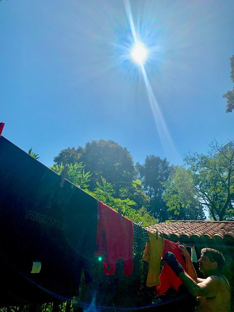 Aprovecho para limpiar la pileta de hojas y bellotas, dado que empezamos el otoño con 30 grados y un sol radiante. Barro los caminos de laja. Vierto microbios en los inodoros para que limpien las cámaras sépticas y los pozos. Tiendo la ropa a secar.