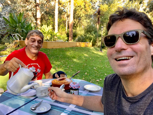 Como nuestro domicilio temporario nos lo permite, enviamos a nuestros amigos y amigas fotos nuestras, tomando el té en el parque. ¡Qué escándalo!
