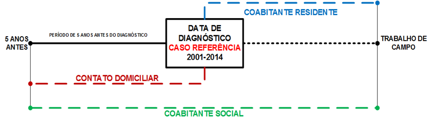 Nesta perspectiva, foram abordados inicialmente os casos referência (primeira pessoa na família com hanseníase detectada), e havendo sua permissão formal, a abordagem incluiria os contatos intradomiciliares (pessoas que viveram ou vivem com o caso referência até cinco anos antes do início do tratamento), coabitantes residentes (pessoas que passaram a viver com o caso referência após este ter concluído a poliquimioterapia) e coabitante social (pessoas que conviveram ou convivem com o caso referência no ambiente familiar, sem no entanto, morar na casa). A Figura 1 é uma representação gráfica do que denominamos de núcleo familiar abordado pelo projeto IntegraHans.