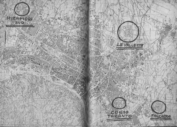 El boom económico que haría de Italia una de las mayores potencias económicas a nivel mundial tenía uno de sus centros en la producción de automóviles y en la FIAT de Turín. Mirafiori Sur, Le Vallette, la Falchera y Corso Taranto se diseñaron para “acoger” a miles de migrantes del sur de Italia que llegaron a sustentar, con su trabajo explotado y no especializado, el aumento vertiginoso de la producción industrial. “Acogida” entre comillas, entonces: la palabra que Scabia usa es “depósito”. Desde diferentes sures rurales, hablando múltiples dialectos, los nuevos obreros-masa son depositados (como cosas, como máquinas) en barrios-dormitorios sin ningún tipo de servicio ni lugares de agregación, mal comunicados con el centro de la ciudad, planificados solo en función de las trayectorias de trabajo. “Guetos” o “cárceles”, como los llaman sus mismos moradores, desarticulados hasta en su interior: “guetos adentro de guetos”, puesto que “las divisiones del mundo del trabajo tienden a reproducirse en el barrio”.[20] Y sin embargo, entre 1968 y 1969, cuando las luchas estudiantiles se enlazan con las luchas obreras, dando lugar a uno de los años de enfrentamientos en las fábricas más importantes de la historia italiana, en los barrios se articulan demandas laborales con las habitacionales (rentas, servicios básicos, escuelas, medios de transporte), que surgen en numerosas asambleas.